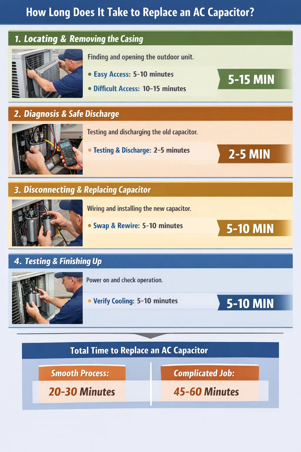 Berapa lama sebenarnya waktu yang dibutuhkan untuk mengganti sebuah kapasitor AC ? Jika Anda hanya melihat beberapa menit saat teknisi bekerja, Anda mungkin mengira pekerjaannya sangat cepat. Namun sejak teknisi datang hingga AC kembali mengeluarkan udara dingin, ada proses yang lengkap.