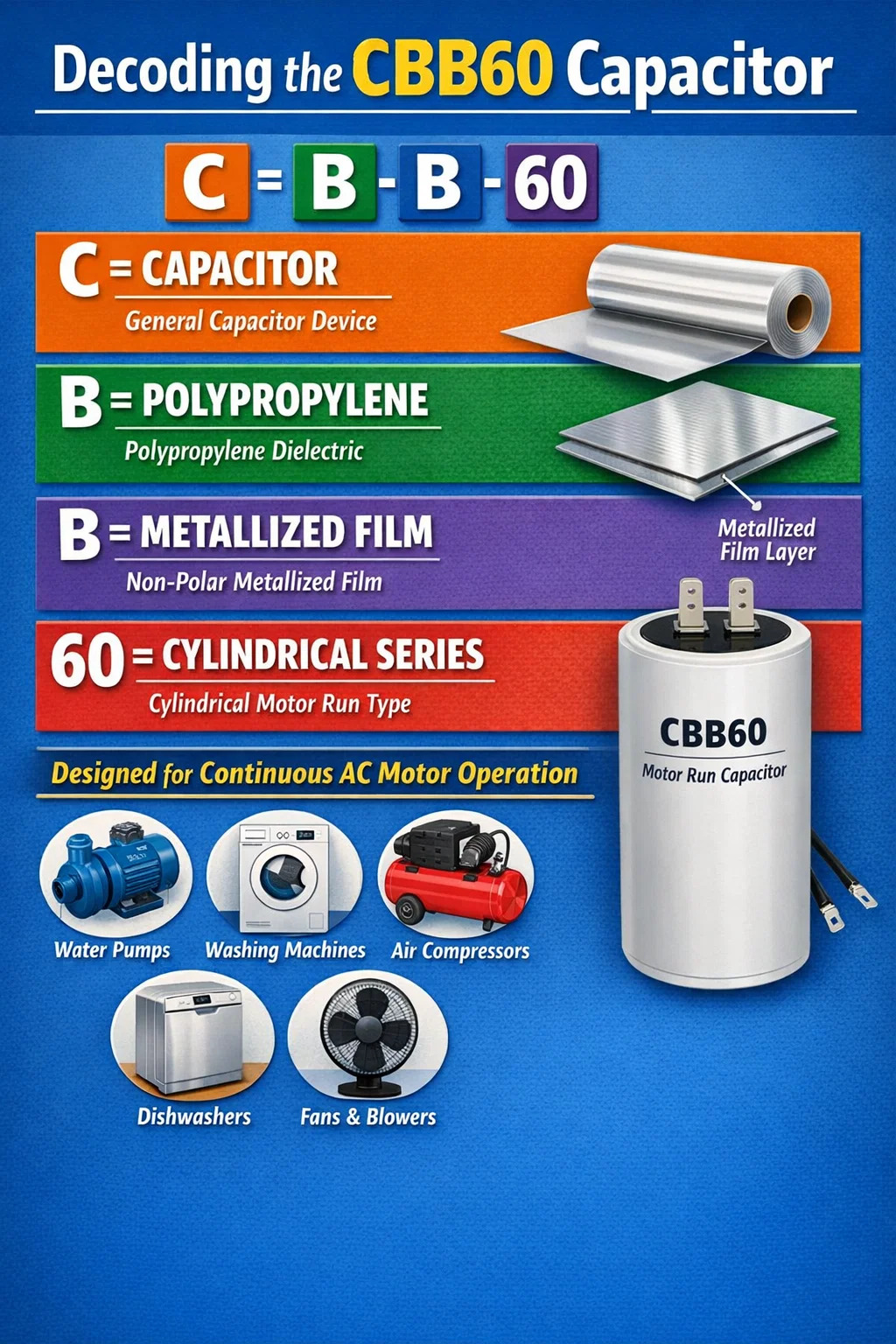 Pada komponen kelistrikan, istilahnya CBB60 adalah kode standar industri Tiongkok (GB) yang mengidentifikasi bahan dielektrik spesifik dan kategori fungsional kapasitor. Dalam bahasa Inggris sederhana, CBB60 mewakili a kapasitor motor film polipropilen metalisasi berbentuk silinder. Komponen ini dirancang khusus untuk tetap berada di sirkuit AC secara terus menerus saat motor berjalan, memberikan pergeseran fasa yang diperlukan untuk menjaga torsi dan efisiensi motor.