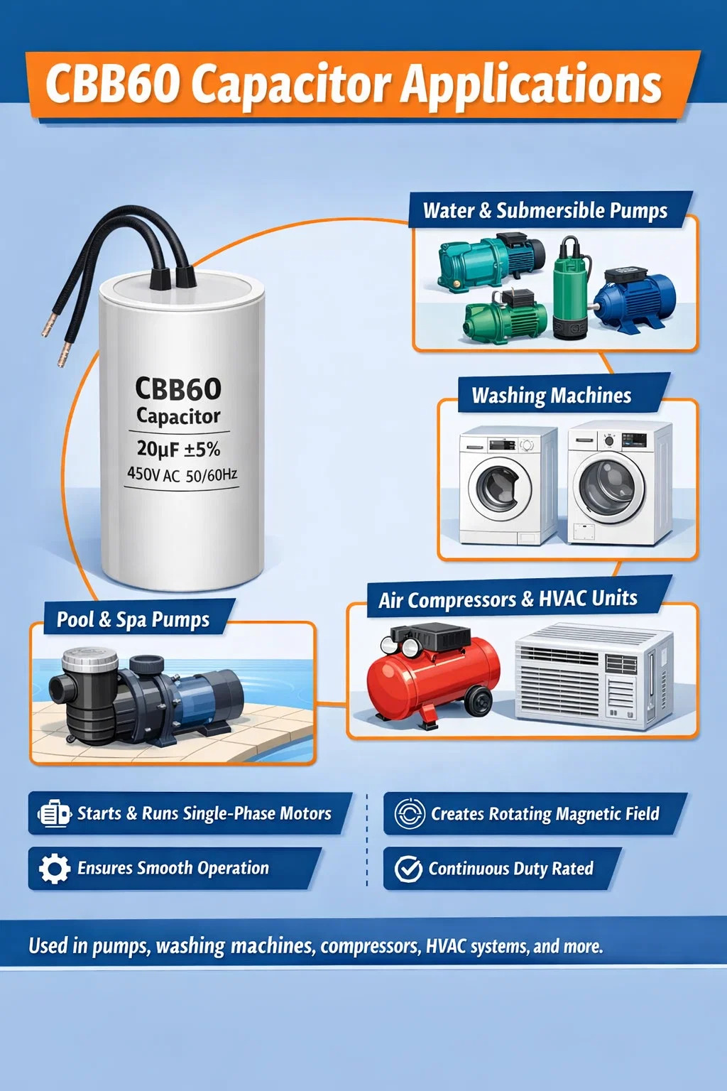 Kapasitor CBB60 muncul dalam berbagai macam peralatan. Meskipun aplikasi pompa mendominasi pasar, kemampuan komponen untuk menangani tegangan AC kontinu pada frekuensi terukur membuatnya cocok di mana pun motor satu fasa memerlukan bantuan untuk menciptakan fasa kedua.