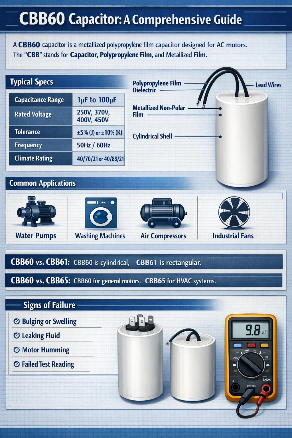 Dibangun dalam cangkang plastik atau aluminium berbentuk silinder, CBB60 dicirikan oleh sifat penyembuhan diri dan ketahanan isolasi yang tinggi. Hal ini paling sering ditemukan pada peralatan rumah tangga seperti mesin cuci, pompa air, dan kompresor udara, biasanya menangani tegangan antara 250V AC dan 450V AC.